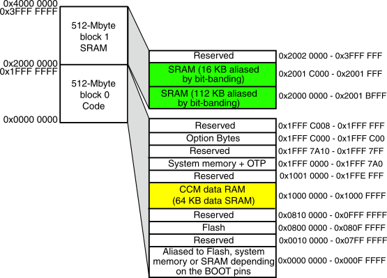 - CCM (Core-Coupled Memory): 64KB (0x10000000 ~ 0x1000FFFF), CPU와 직접 연결된 고속 메모리, 고속 코드/데이터 (High-speed memory directly connected to the CPU, used for high-speed code/data).