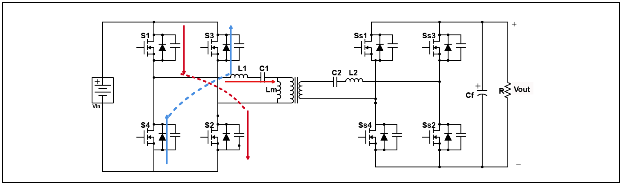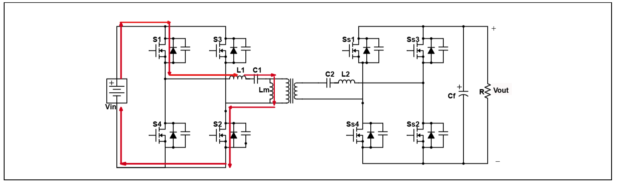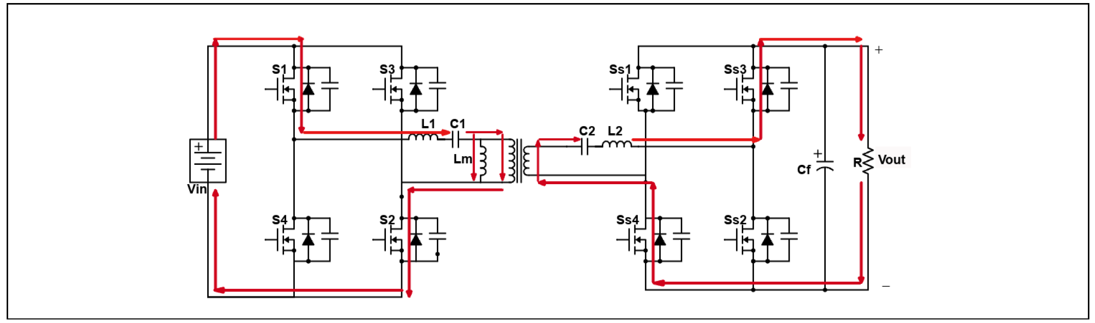 - 상태 1 (전력 전달): 1차 측 스위치(S1/S2 온)로 공진 탱크를 통해 전력 전달. 2차 측은 동기 정류(SR) 스위치(Ss3/Ss4)로 정류. 공진 전류(I_ab, I_cd)가 HFT를 통해 흐름.