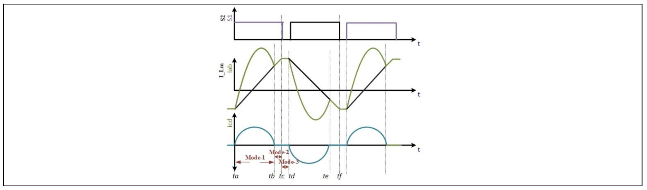 - 상태 2 (프리휠링): 스위칭 주파수(fs) < 공진 주파수(fr)일 때 발생. 공진 탱크 에너지 순환, 출력 전류 감소.