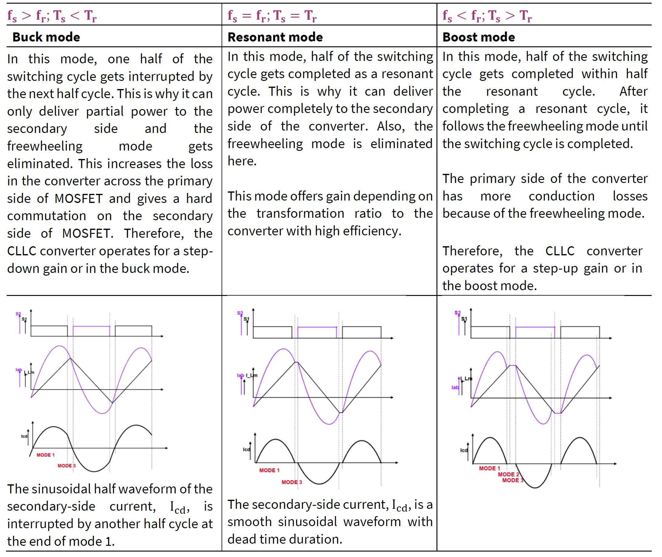 - fs > fr: 벅 모드, 부분 전력 전달, 하드 스위칭.