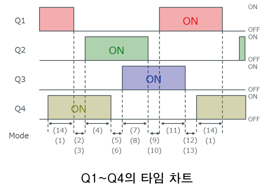 PSFB 컨버터는 위상 천이 제어를 통해 ZVS를 구현하며, 다음과 같은 동작 모드를 가집니다: