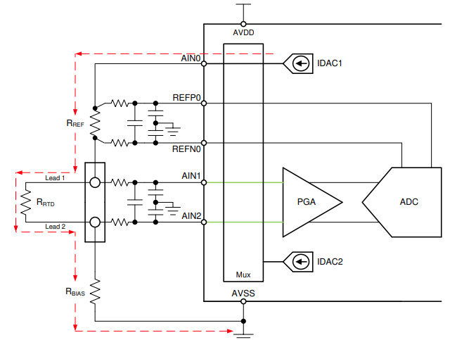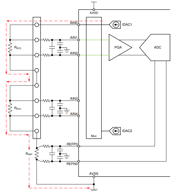 Path : IDAC1(AIN0) → RTD(Lead1-2) → R_REF → AVSS. 입력: AIN1-AIN2.