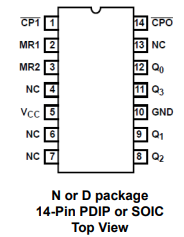 이 칩들은 클럭 신호가 들어올 때마다 Q출력 핀에 2진수 형태로 카운트 값을 출력합니다.
