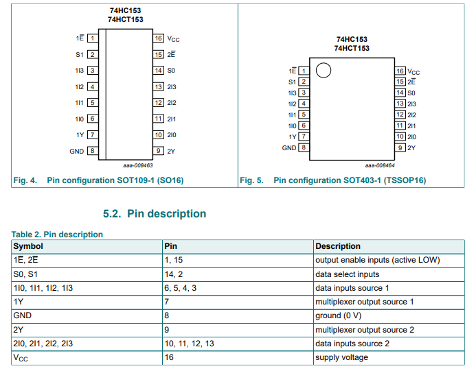 - 74HC153: 듀얼(2섹션) 4:1 멀티플렉서 (각 섹션이 4개의 입력 중 1개 선택)