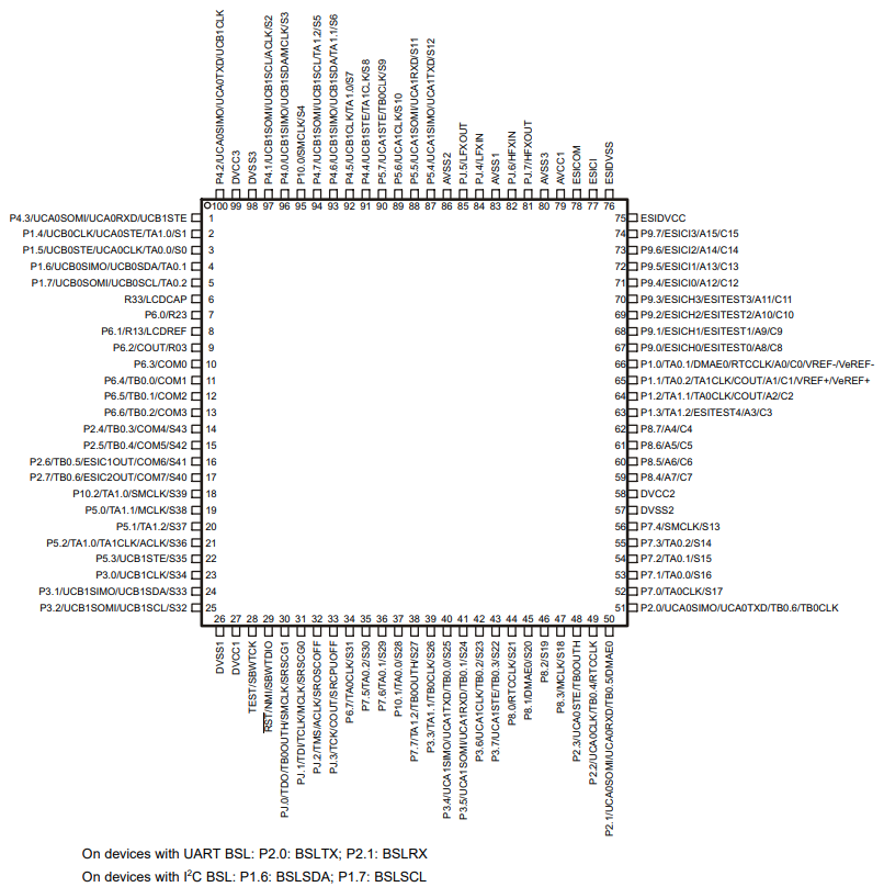 - P4.0 ~ P4.7: 다목적 GPIO, ADC 입력, 타이머, BoosterPack 핀 J1.6 ~ J1.10, J2.11 ~ J2.13