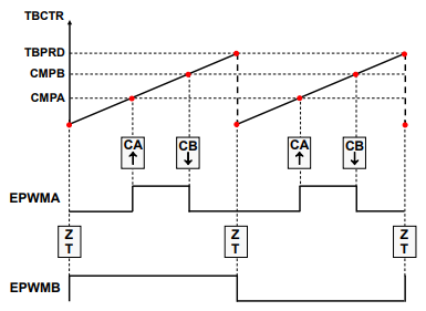 위 그림에서, EPWMA 출력은 타임-베이스 카운터가 0일 때(제로 매치) High로 설정되고, 비교 A 매치(CMPA)에서 Low로 클리어됩니다. EPWMB 출력은 제로 매치에서 High로 설정되고, 비교 B 매치(CMPB)에서 Low로 클리어됩니다.