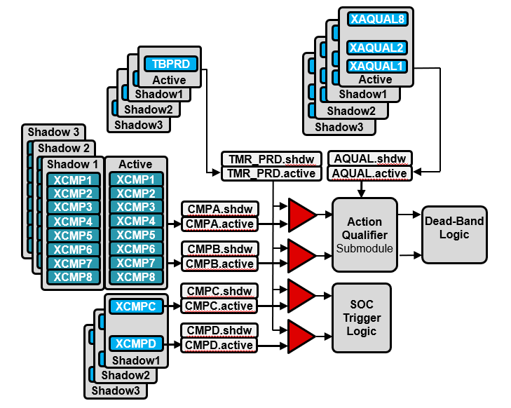 XCMP Mode는 복잡한 PWM 파형 생성을 위해 추가 레지스터와 쉐도우 로드를 제공합니다.