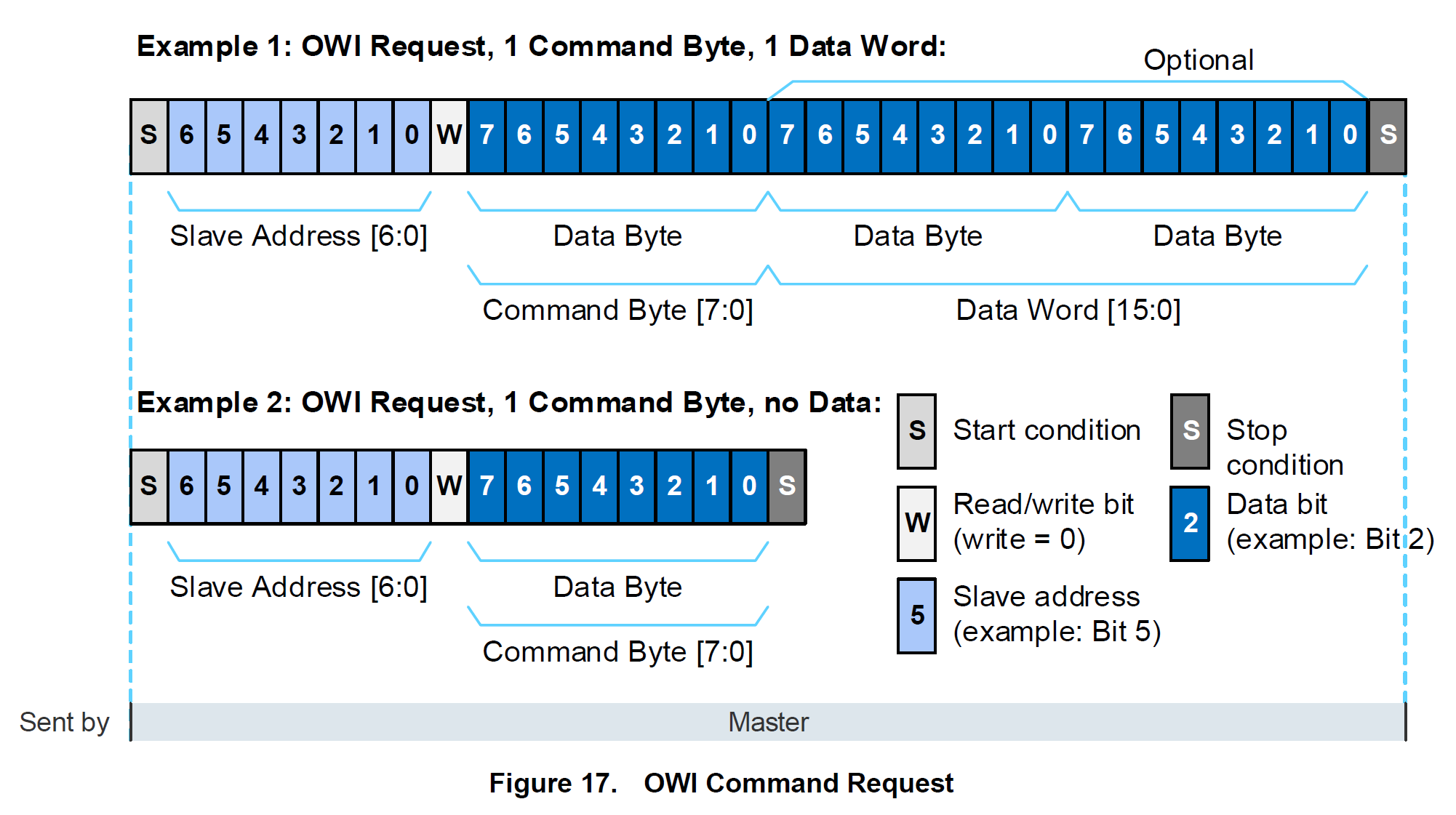- 시작 비트 (Start Bit): OWI 핀을 tOWI_START(최소 10µs) 동안 로우로 설정 후 하이로 복귀(Figure 15).