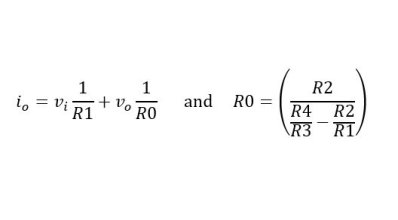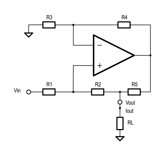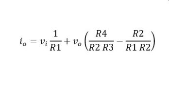 R1/R2 비율을 R3/R4 비율과 같게 설정하면(예를 들어 모든 저항을 동일하게 만들어서) 출력 노드의 임피던스는 무한대로 수렴하게 되며 따라서 출력은 v i /R1 값을 갖는 전압 제어 전류 소스가 됩니다. 실제로 회로의 성능을 극대화하려면 저항 비율이 잘 정합되어야 하고 CMRR이 좋은 연산 증폭기가 필요합니다.