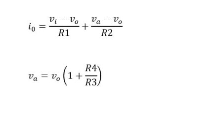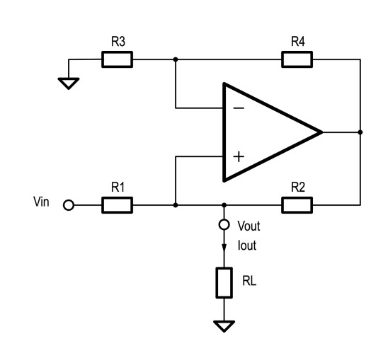 그림 1 기본 구성을 보여줍니다. 부하 저항을 통해 흐르는 전류는 저항 R1과 R2를 통과하는 전류의 합입니다. 또한 연산 증폭기가 비반전 증폭기를 형성한다는 것을 알 수 있습니다. 이를 통해 두 가지 방정식을 얻을 수 있습니다.