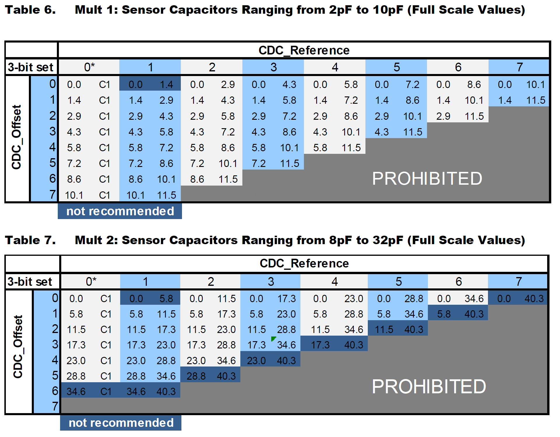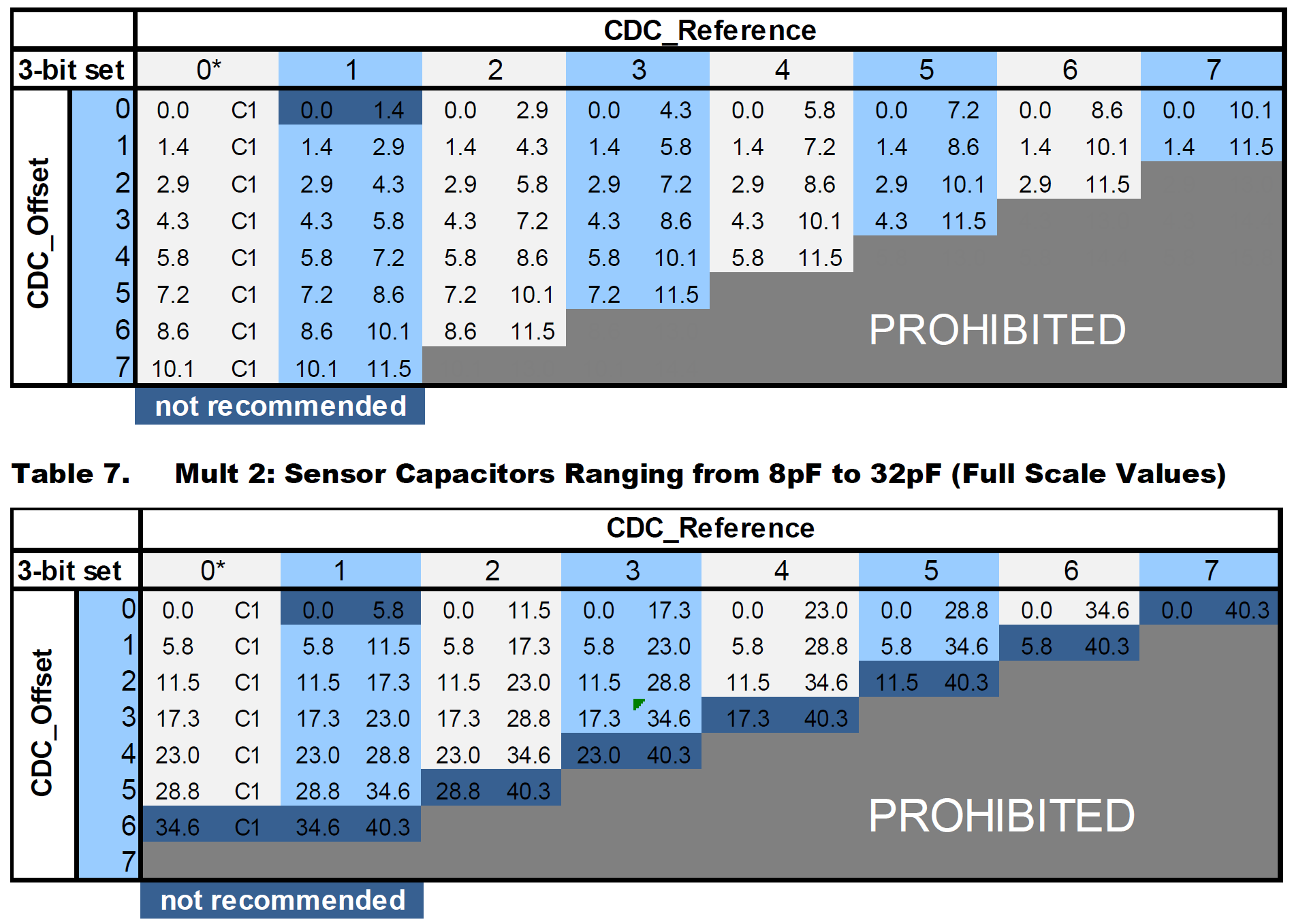 - CDC_Offset 및 CDC_Reference: Table 6~9에 따라 Mult 값에 맞는 설정을 선택합니다. 예를 들어, Mult 1의 경우 Table 6에서 센서 커패시터 범위(2pF~10pF)에 따라 적절한 값을 설정합니다.