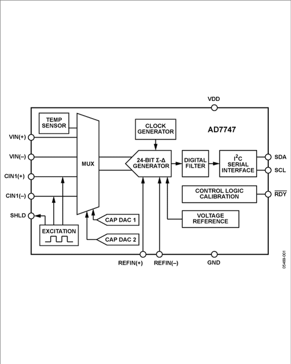 AD7747은 정전용량 센서의 변화를 디지털 데이터로 변환하는 고성능 CDC입니다 (is a high-performance CDC that converts capacitance sensor changes into digital data). 주요 특징은 다음과 같습니다 (key features include):